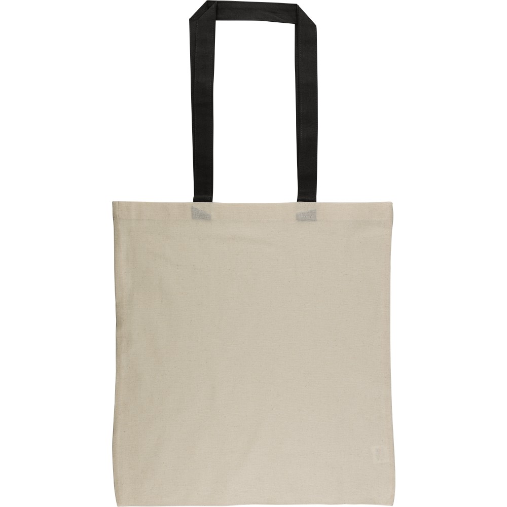 Oeko-Tex minősítésű, 140 g/m2 pamutból készült bevásárlótáska natúr színben, színes fülekkel. Mérete 38 × 42 cm, a fülek hossza 70 cm, szélessége 2,5 cm. Oeko-Tex címkével ellátva.