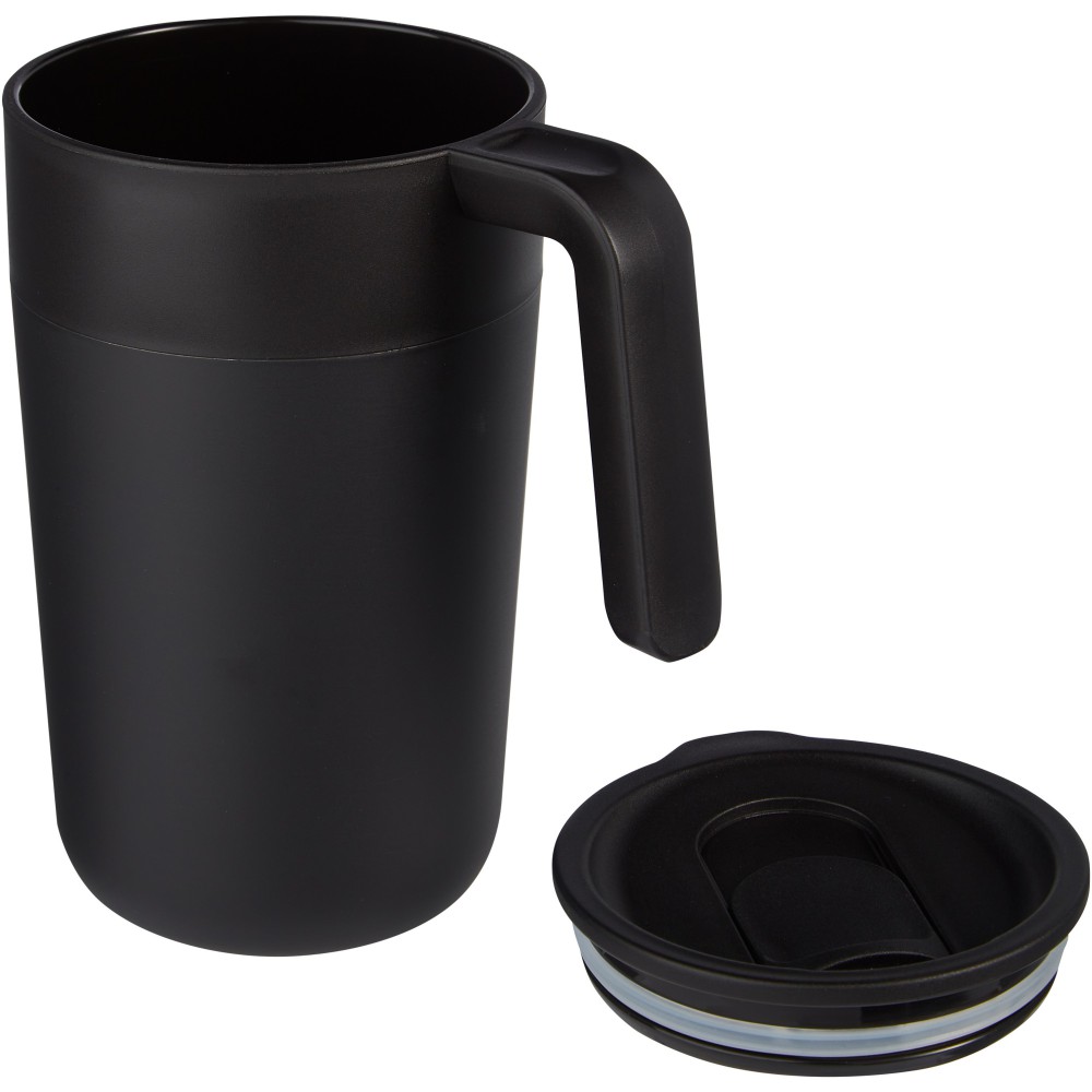 A stílusos Nordia bögre rozsdamentes acél külsővel és fenntartható újrahasznosított PP belsővel készült. A belső fedél, a csúszka és a fül is újrahasznosított PP-ből készül, tanúsított és felelős forrásból. A fedele szivárgásmentes, csúsztatható zárással, így ez a bögre tökéletes italok fogyasztásához útközben. BPA-mentes, a német élelmiszerbiztonsági törvény (LFGB) szerint tesztelt és jóváhagyott, és a REACH előírásai szerint ftaláttartalomra tesztelve. Űrtartalma 400 ml. Kézi mosogatása ajánlott. Újrahasznosítható PP műanyag, rozsdamentes acél.