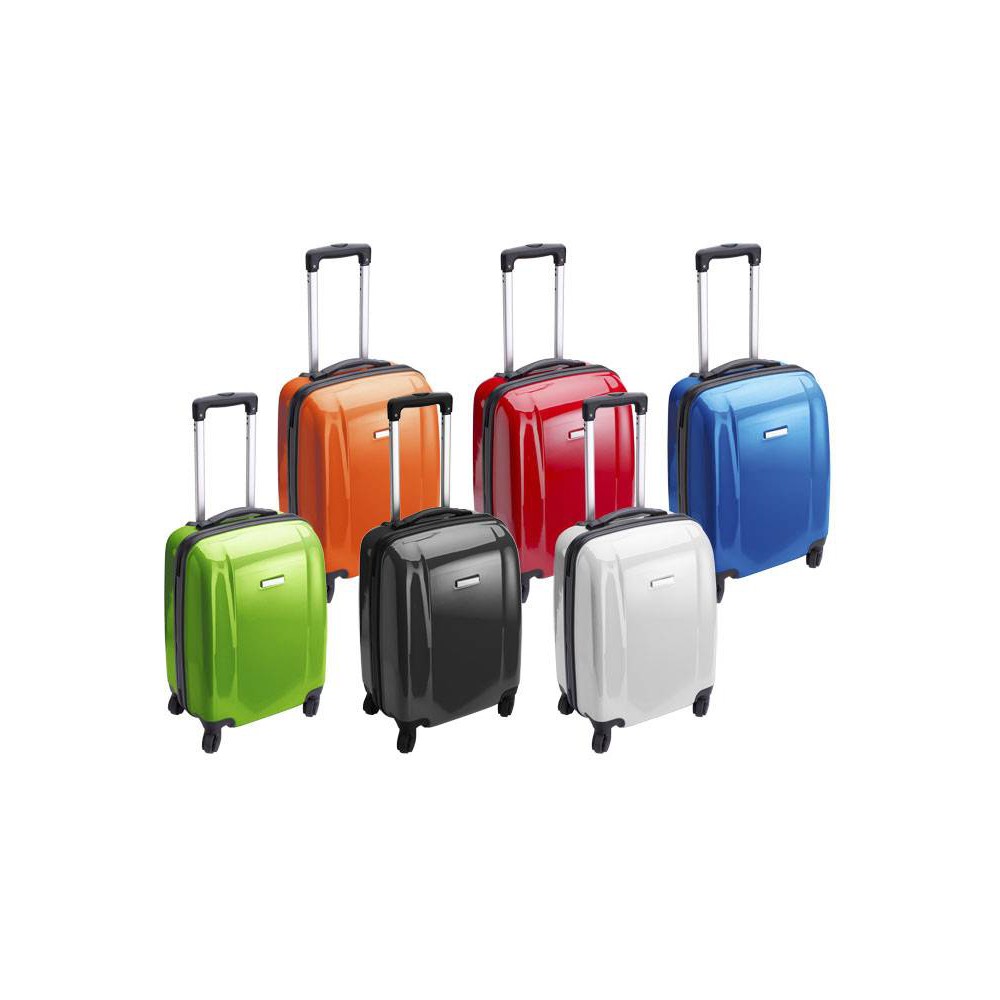 Keményfedelű bőrönd PC/ABS műanyagból, 4 körbeforgó kerékkel, beépített számzárral. Emblémzásra alkalmas fémlappal, ami fixen a terméken van.