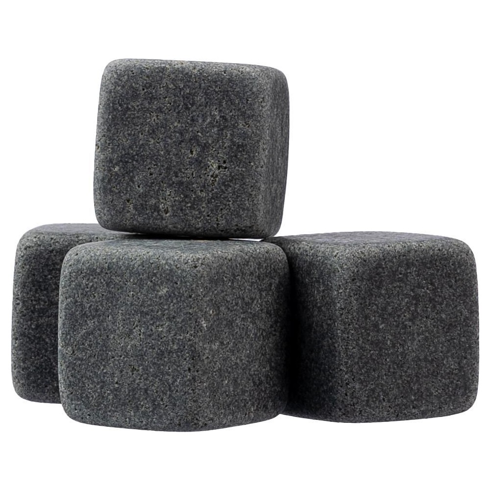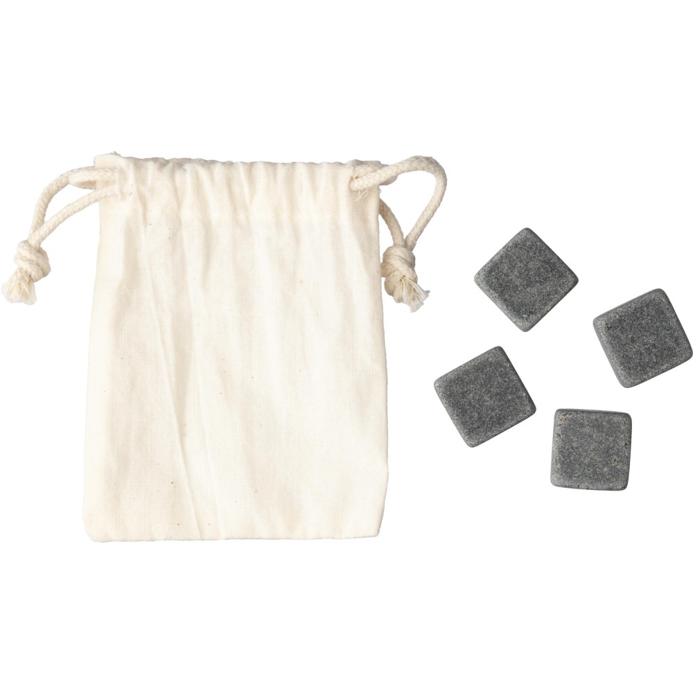 4 db újrafelhasználható természetes kőből álló kockakészlet. A köveket hűtőbe kell tenni, hogy lehűljenek. Pamut zsinóros tasakban csomagolva érkezik.