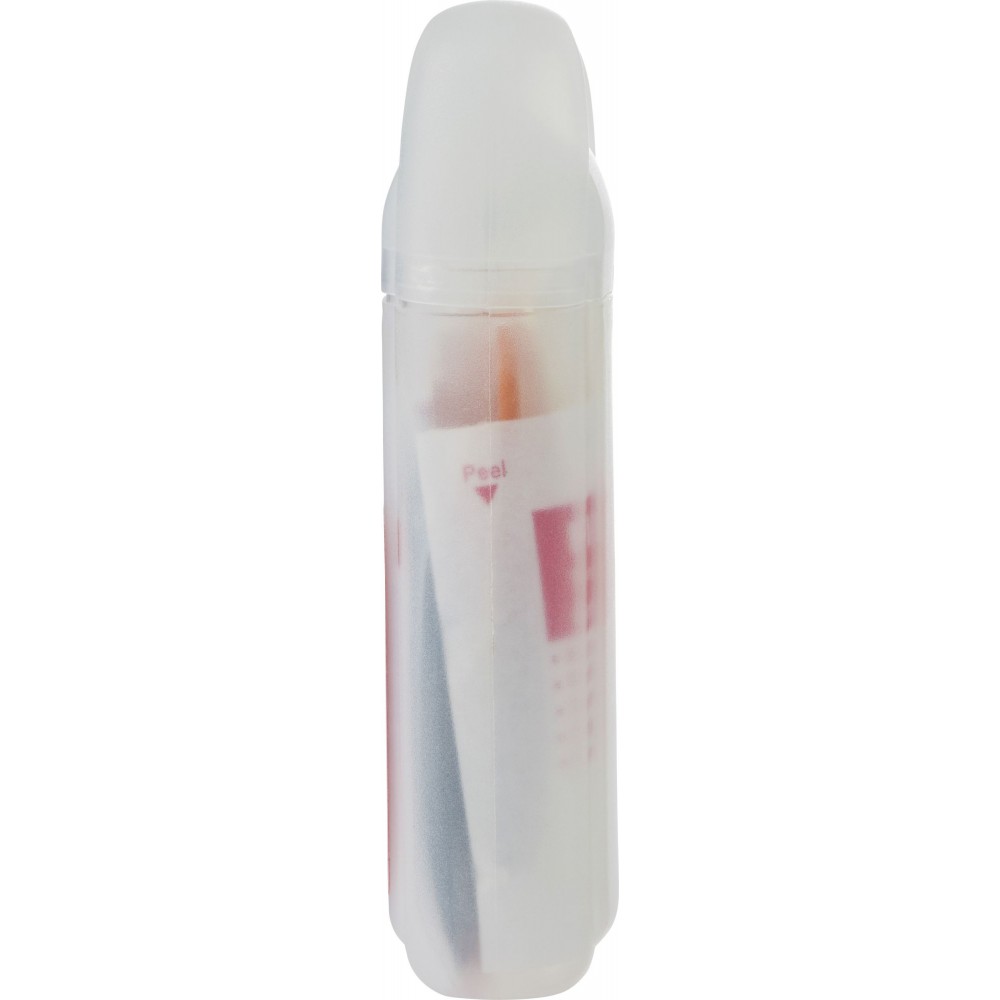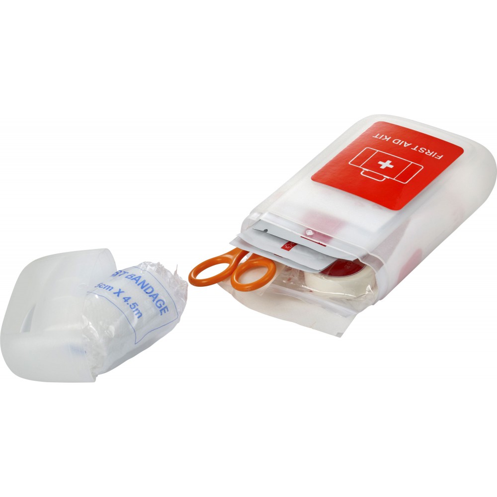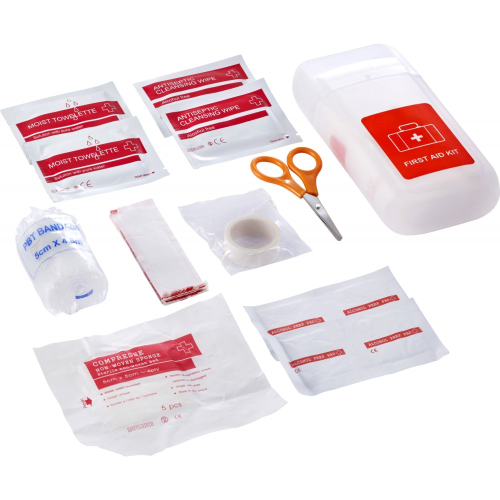 Elsősegélykészlet PP műanyag átlátszó tartóban. A készlet tartalma: 1 db kötés, 1db nemszőtt szivacs, 5 db steril kötés, 1 db PBT kötés, 4 db alkoholos fertőtlenítő, 2 db nedves törlőkendő, 1 db fertőtlenítő kendő, ragtapasz és 1 db olló. PP