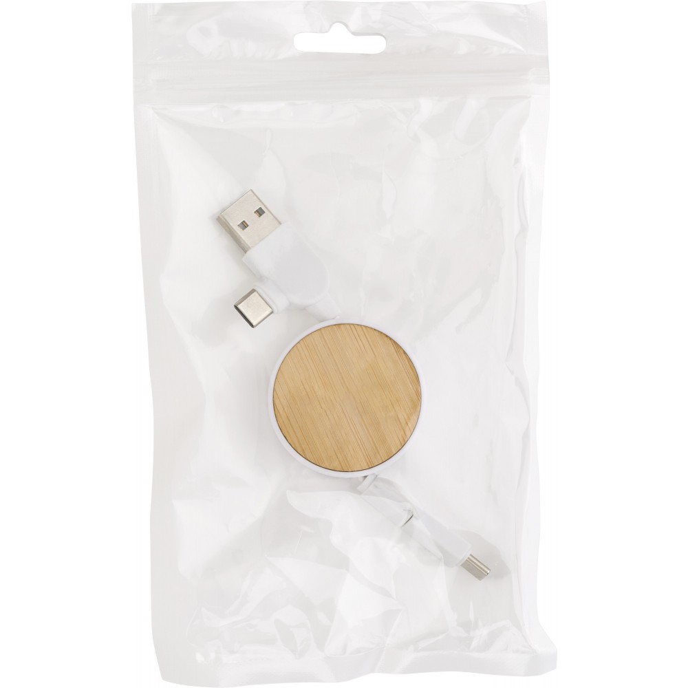 ABS hosszabbítható töltőkábel bambusz elemekkel. USB-C-vel, Lightning-gel és USB-A-val. Egyenként, barna kartontasakba csomagolva.