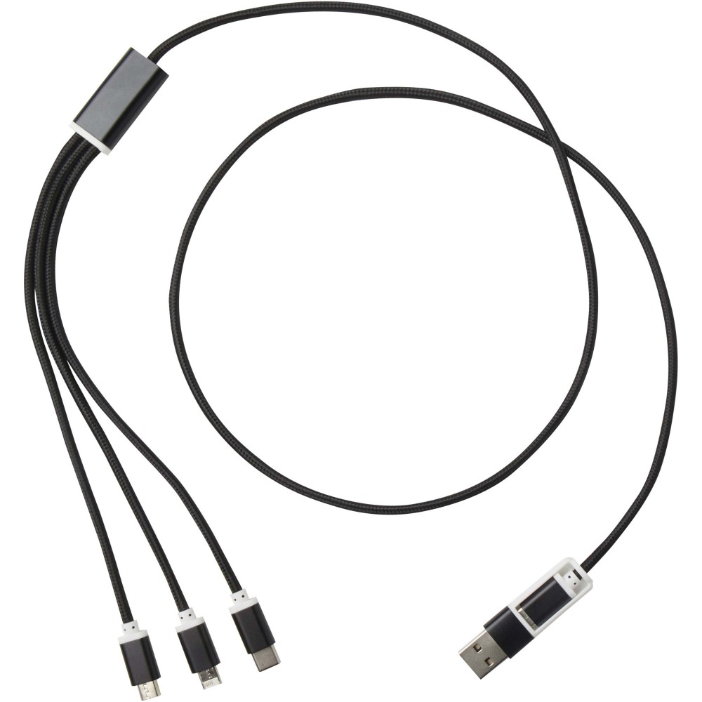 Ez a kábel USB-A és Type-C bemeneti csatlakozóval, valamint Type-C, Micro USB és Lightning/Micro USB kombinált kimeneti csatlakozóval rendelkezik. A csatlakozóknak köszönhetően a legtöbb iOS/Android okostelefont, fényképezőgépet, powerbankot és fülhallgatót töltheted. A kábel hossza 100 cm, újrahasznosított alumíniumból és RPET-ből készült.