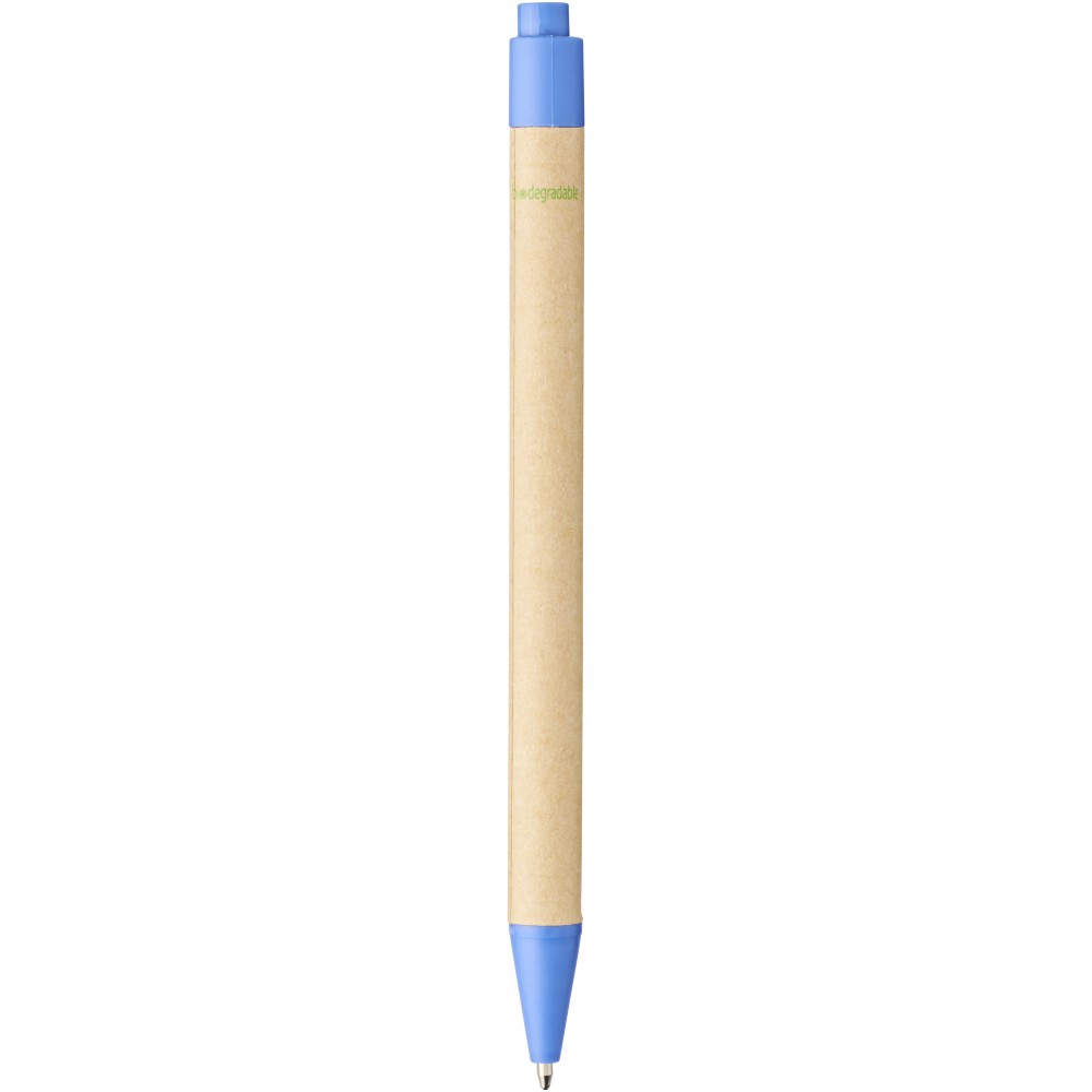 Környezetbarát golyóstoll fekete tollbetéttel, nyomógombos mechanizmussal, biológiailag lebomló papíranyagból készült tolltest és kukorica műanyag kiegészítők. Az újrahasznosított kartondoboz színe nem egységes.