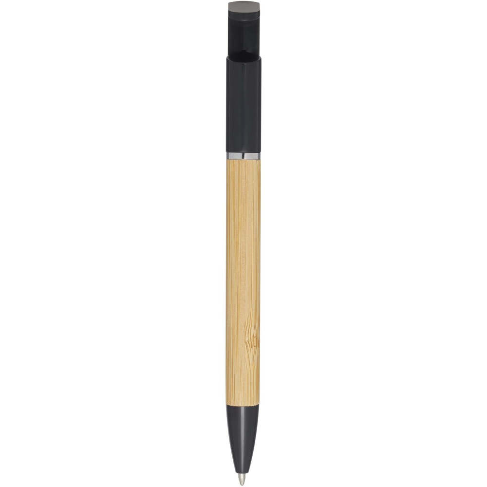 Bambusz golyóstoll, amely telefontartóként is funkcionál. A gomb és a középső gyűrű újrahasznosított műanyagból, a hegy rézből, a tollteste pedig felelősen beszerzett bambuszból készült. Fekete tollbetéttel. Írási hossz: 1000 méter. Tollhegy mérete: 1,0 mm.