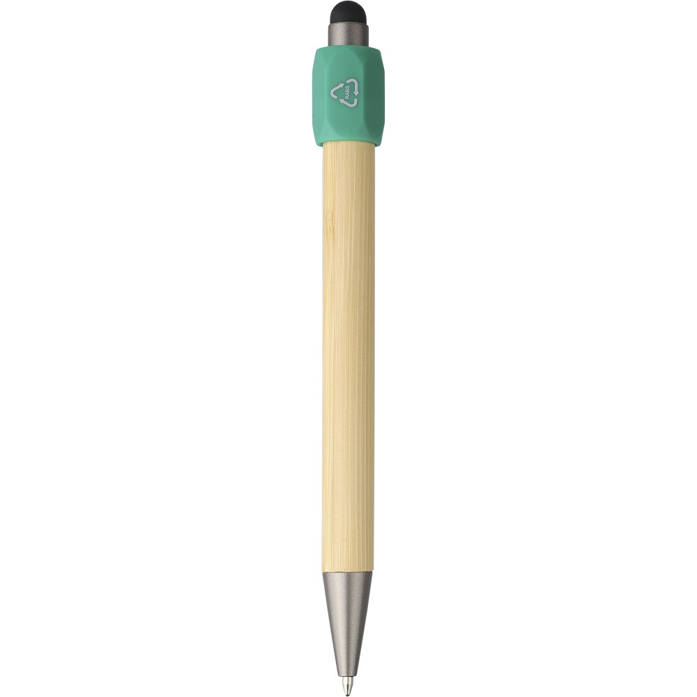 Bambusz golyóstoll újrahasznosított ABS pörgettyűvel és fekete érintővel a nyombógombon. A tollhegy vastagsága 1.0 mm, íráshossz: kb. 800 méter. Az újrahasznosított anyagra utaló logó a tollra van gravírozva.