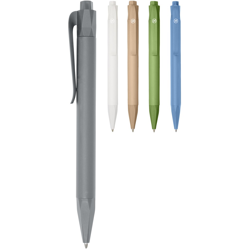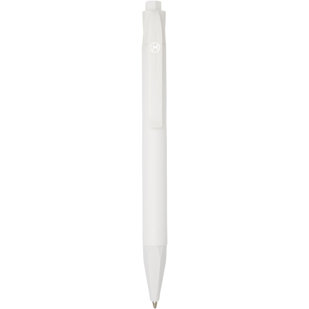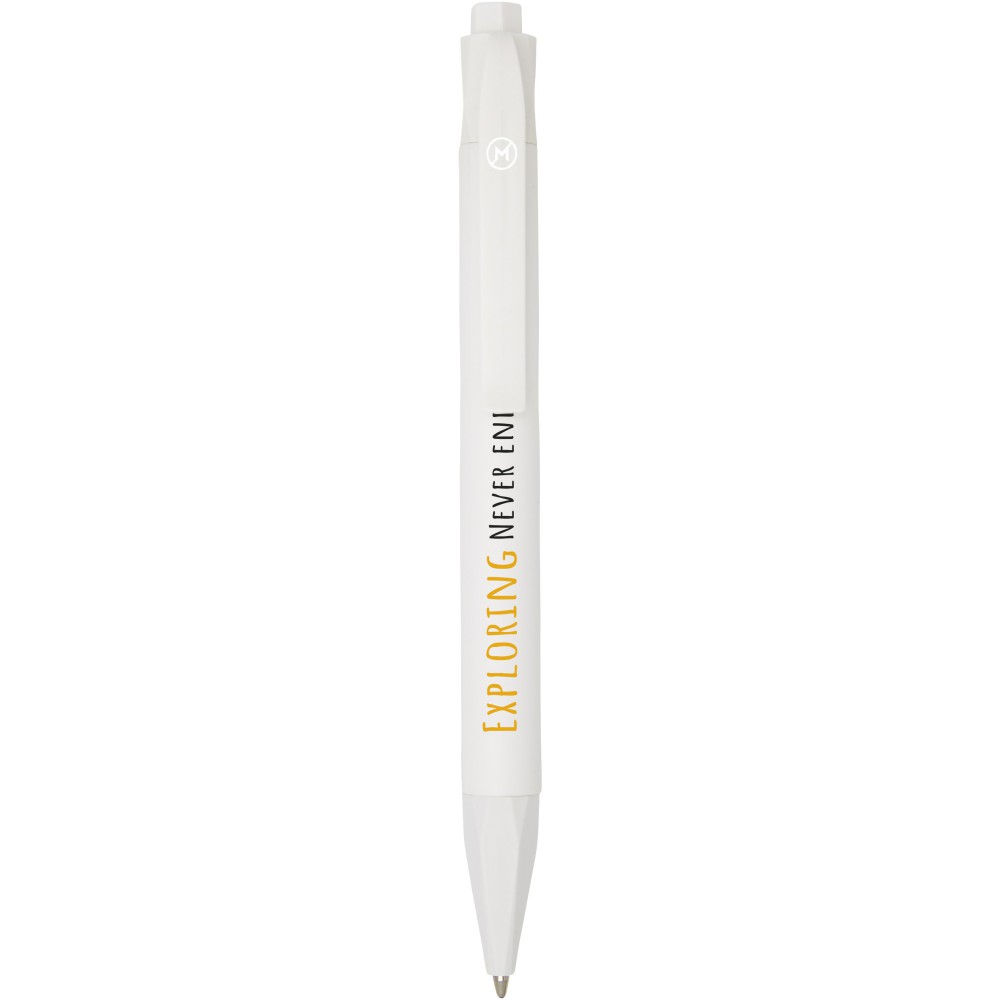 Nyomógombos golyóstoll cserélhető kék tollbetéttel. 100% PLA (kukoricából készült műanyag), amely csökkenti a felhasznált, hagyományos műanyag mennyiségét. A tollbetét íráshossza 2000 méter. Csomagolás karton tok. PLA műanyag.