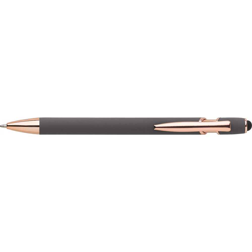 Alumínium golyóstoll rózsaarany részletekkel és érintővel, kék tollbetéttel.