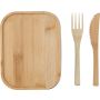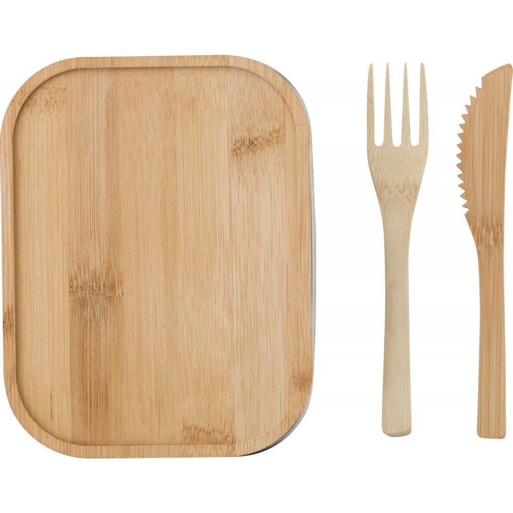 Rozsdamentes acél ételdoboz bambusz fedővel, késsel, villával, összefogó pánttal. 600 ml.