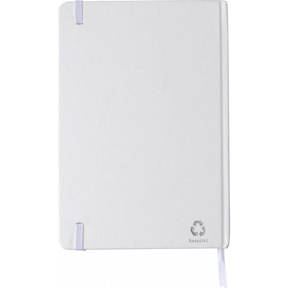 Újrahasznosított kartonból készült A5-ös jegyzetfüzet 80 vonalas lappal. Gumis záródás és könyvjelző szalag.