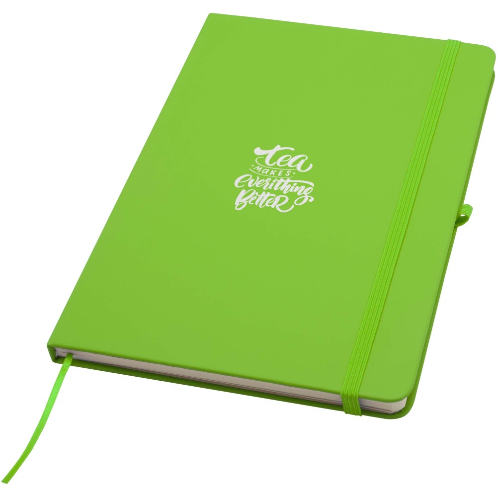 A Spectrum Plus A5 keményfedeles jegyzetfüzet lekerekített sarkokkal nemcsak az irodai mindennapok elengedhetetlen kelléke, hanem remek lehetőség márkád népszerűsítésére is. A jegyzetfüzet puha tapintású borítóval rendelkezik és 80 vonalas, krémszínű, 70 g/m2-es lapból áll, amely tökéletes gyors ötletek vagy hosszabb jegyzetek rögzítésére. A jegyzetfüzet tolltartó hurokkal, gumiszalagos záródással, könyvjelzővel és harmonikazsebbel van ellátva.
