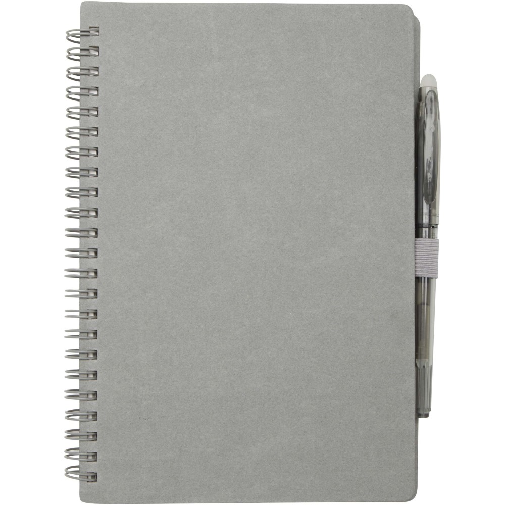 Újrahasználható, kőből készült kemény fedeles jegyzetfüzet és toll szett. A jegyzetfüzet borítója kartonból készült, lekerekített sarkokkal, és 32 lap 120 g/m2 súlyú vonalas kőpapír lapot tartalmaz. A kőpapír 100%-ban famentes, és előállítása kevesebb energiát igényel, mint az újrahasznosított vagy új cellulózpapíré. A jegyzetfüzet hátulján zseb található a mellékelt fekete törlőkendő tárolására. Tartozék továbbá egy újrahasznosított műanyagból készült törölhető toll átlátszó tolltesttel, fehér radírral a tetején, és színes, tömör fogórésszel. Tinta színe: fekete. Íráshossz: 250 méter. Tollhegy mérete: 0,7 mm.