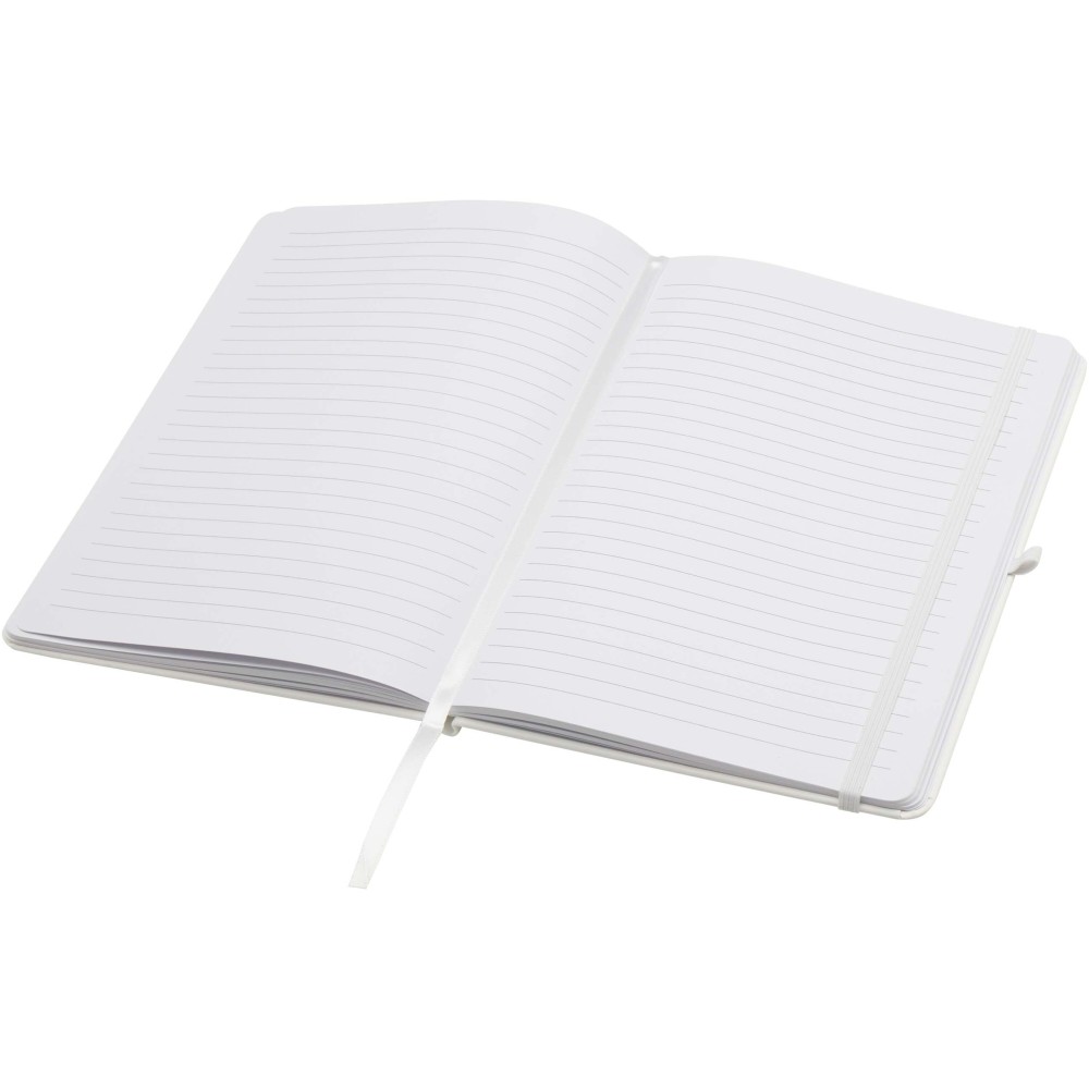 A Teak A5 méretű, újrahasznosított karton keménytáblás jegyzetfüzet lekerekített sarkokkal nemcsak irodai alapdarab, hanem kiváló lehetőség a márka népszerűsítésére is. A jegyzetfüzet 96 darab 70 g/m2-es vonalas lapot tartalmaz és puha tapintású borítóval rendelkezik. Beépített tolltartó hurokkal, rugalmas zárópánttal és könyvjelzővel van ellátva.