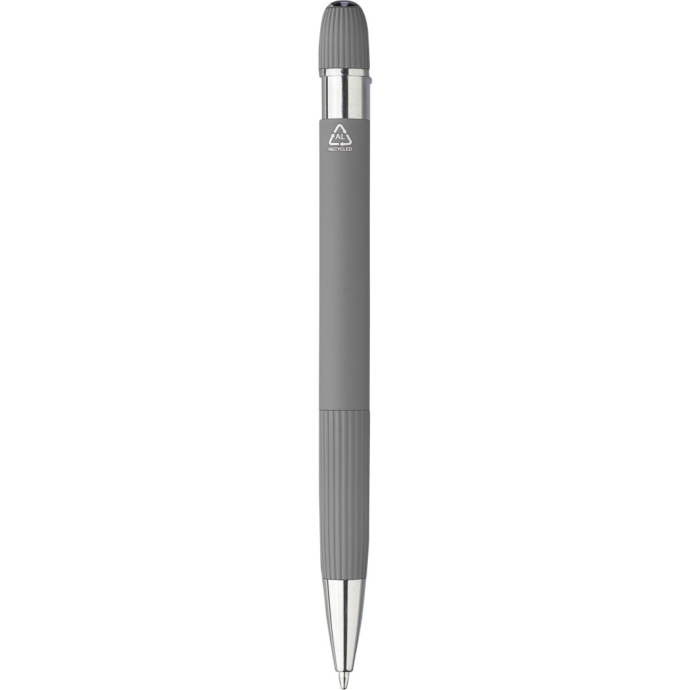 Újrahasznosított PU jegyzetfüzet és golyóstoll szett. A jegyzetfüzet kb. A5-ös méretű, 100 lapos, 80 g/m2-es vonalas lapokkal és szalagos könyvjelzővel, kordbársony hatású borítóval és dombornyomott újrahasznosított logóval rendelkezik. A golyóstoll gumírozott felülettel, csíkos markolattal, krómozott heggyel és lézergravírozott újrahasznosított logóval rendelkezik. Erős barna kartondobozban, EVA betéttel. Kék tollbetéttel szállítjuk.
