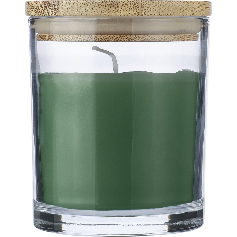 Üveg gyertyatartó 120 g vanília illatú, színes viasszal és bambusz fedéllel. Kb. 20 óra égési idővel. Csomagolása fehér papírhenger.