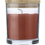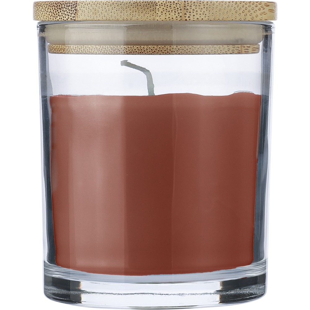Üveg gyertyatartó 120 g vanília illatú, színes viasszal és bambusz fedéllel. Kb. 20 óra égési idővel. Csomagolása fehér papírhenger.