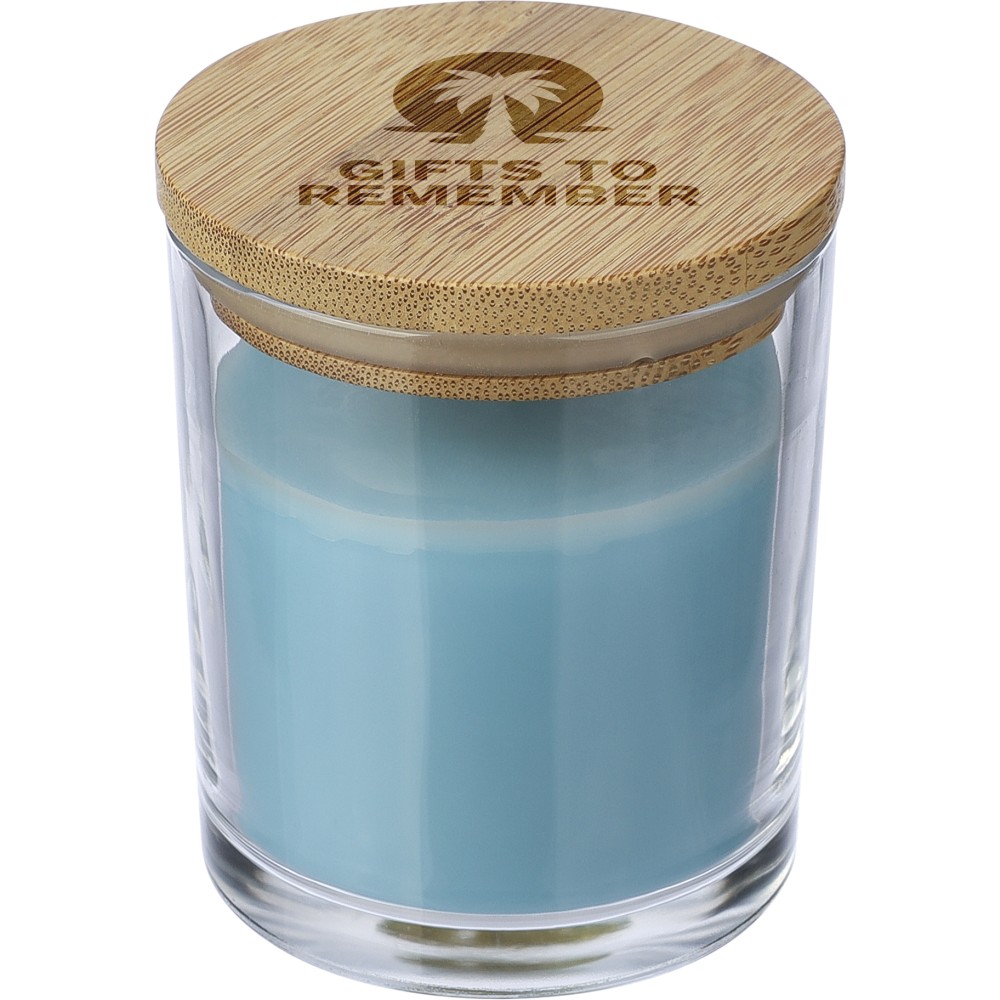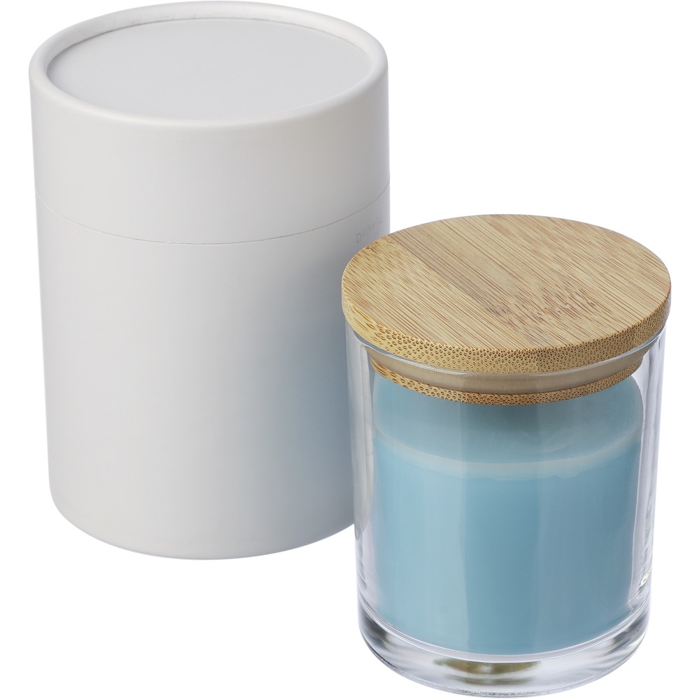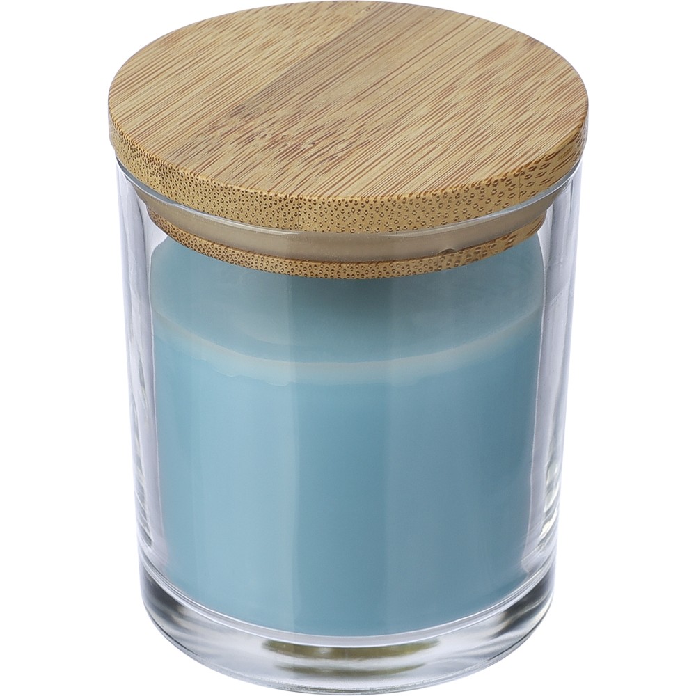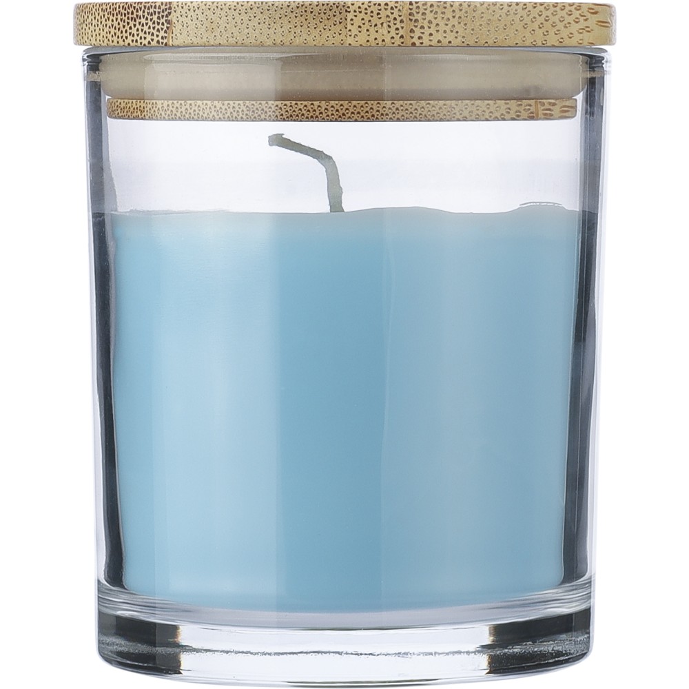 Illatgyertya üveg tartóban, világoskék