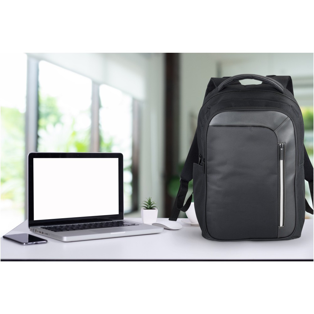 Elegáns, trendi, 15,6 -es laptop hátizsák nagy cipzáras, kulcstartós első zsebbel és rejtett RFID technológiájú blokkoló zsebbel a kártyák és okmányok adatlopás elleni védelme érdekében. A nagy, cipzáras fő tárolórész 15,6 -es laptop tárolására alkalmas, és elkölönített, párnázott résszel rendelkezik iPad vagy tablet számára. Az első, függőleges cipzár nyújt hozzáférést az első zsebhez. Két kiegészítő oldalzseb további tárolási lehetőséget biztosít, a párnázott, állítható vállpántok kényelmes viseletet nyújtanak, a hordozófül és a gurulós bőröndre húzható zseb lehetővé teszi a könnyű hordozást.