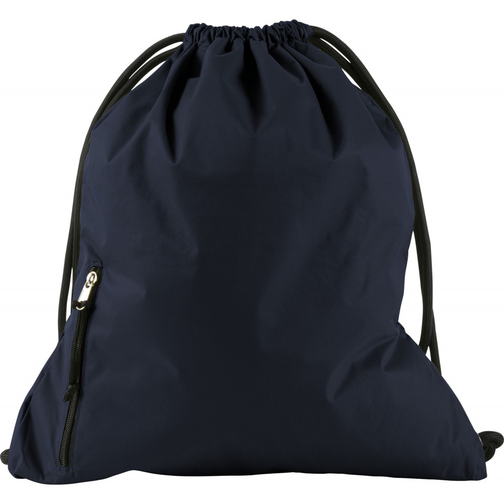 Tornazsák húzózsinórral, elöl cipzáras zsebbel. 190T nylon.