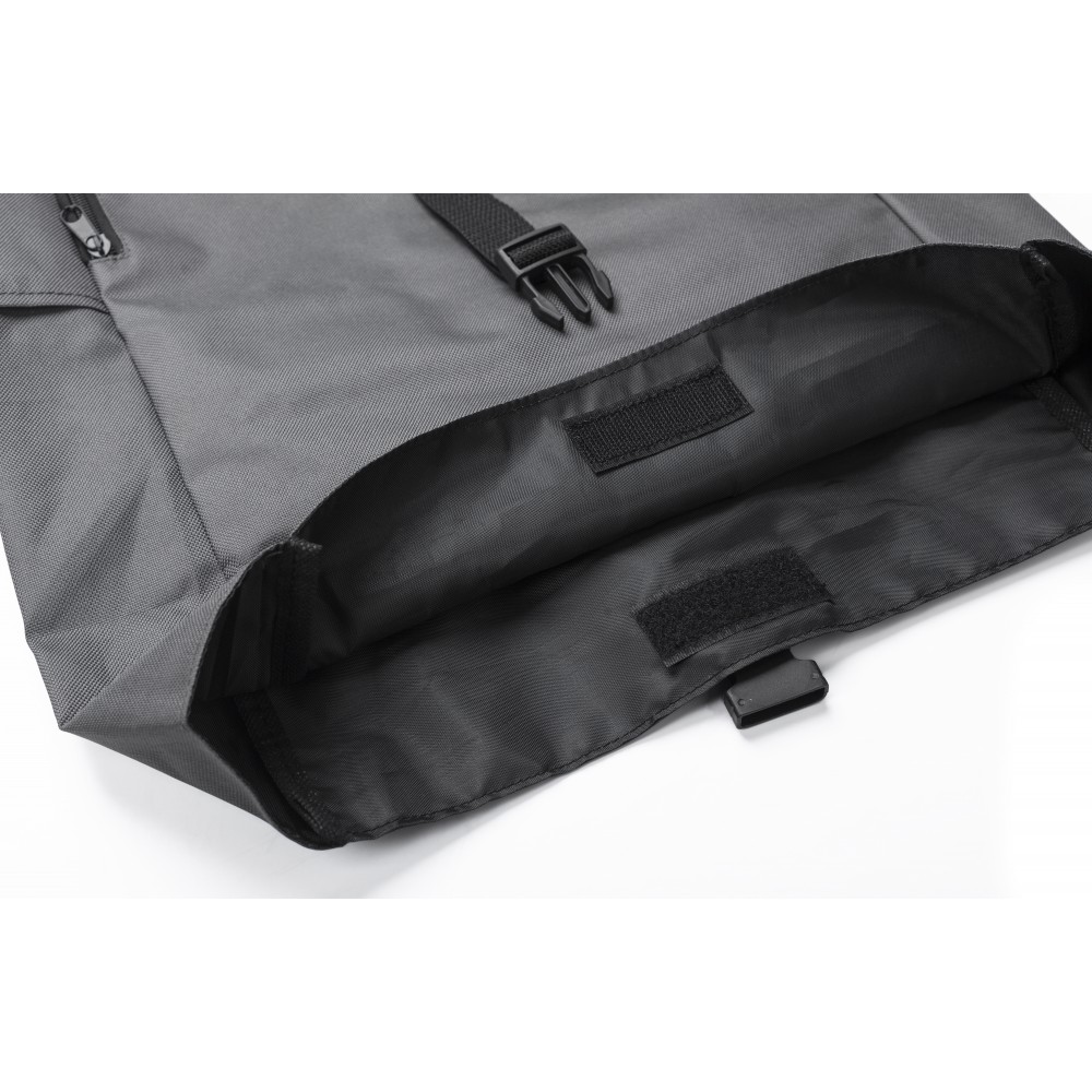 Rolltop hátizsák. Két cipzáras zseb az oldalán, egy nagy rekesz. Tépőzárral és csattal záródik. 600D RPET poliészter.