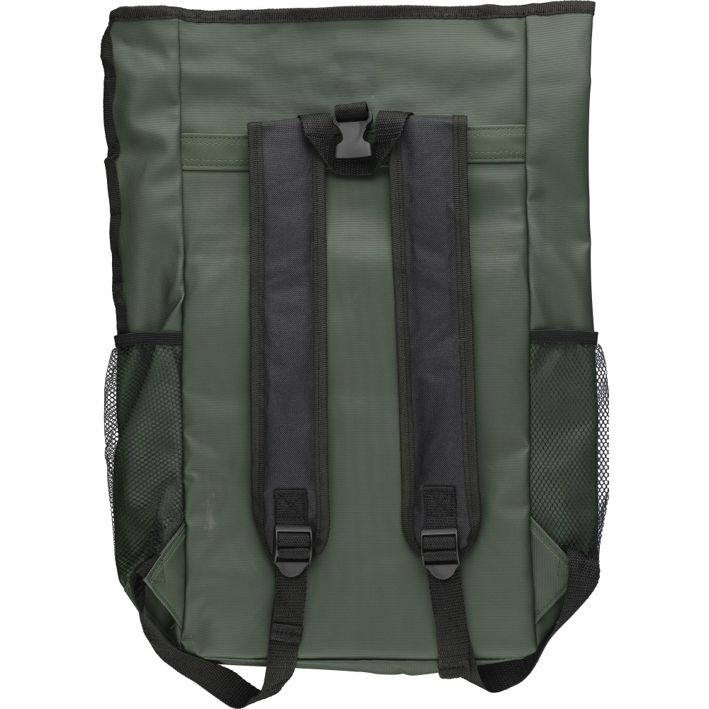 600D rPET poliészter roll-top hátizsák. PU bevonat teszi vízlepergetővé. Rejtett cipzáras első zsebbel, hálós oldalzsebekkel, 15 -es laptop számára kialakított tárolórésszel, 5 tárolórekesszel, állítható vállpánttal. Kapacitása 25 liter, teherbírása 15 kg. Oldalán rPET címkével.