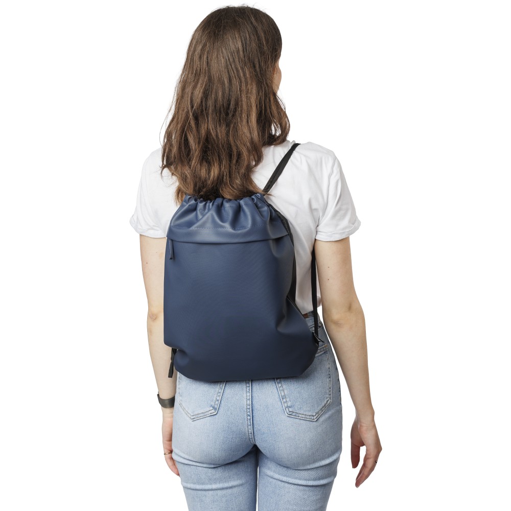 600D rPET poliészter tornazsák. Az elejét PU bevonat teszi vízlepergetővé. Rejtett cipzáras első zsebbel, két tárolórésszel, első és belső zsebekkel. Kapacitása 8 liter, teherbírása 8 kg. Oldalán rPET címkével.