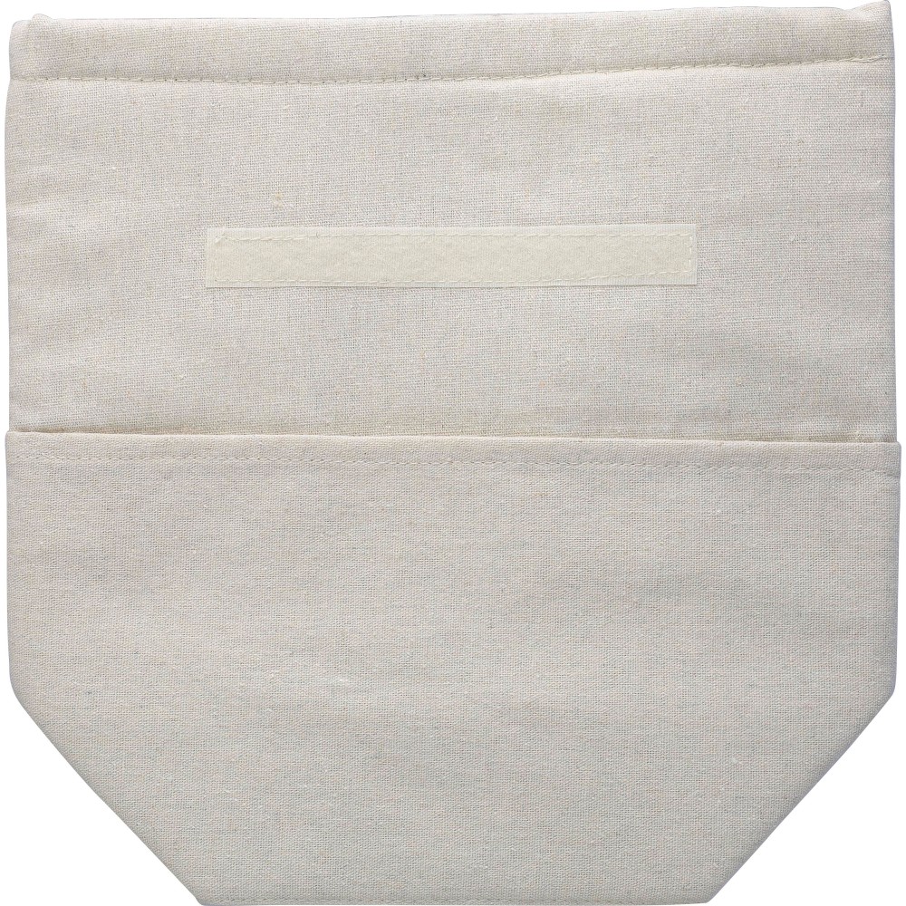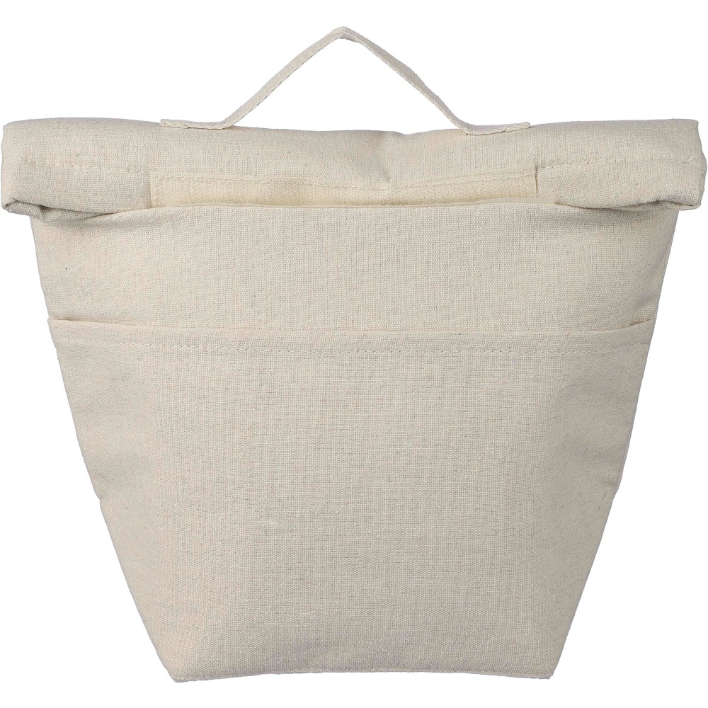 Feltekerhető hűtőtáska, belsejében 3 mm EPE és 12C PEVA béléssel. Tépőzáras záródással, egy kis elülső zsebbel és rövid hordozópánttal a tetején. Az oldalon újrahasznosított pamut anyagra utaló címkével. Újrahasznosított pamut 220 g/m2.