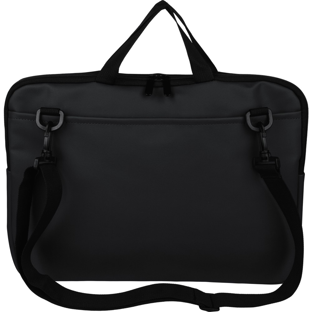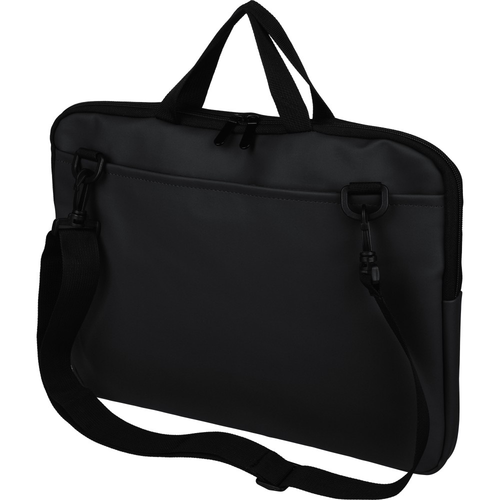 Újrahasznosított PU anyagból készült laptoptáska legfeljebb 15 hüvelykes készülékekhez, 4 mm vastag párnázással és 210D újrahasznosított béléssel. Elülső cipzáras zsebbel, hátoldali tépőzáras zsebbel, két rövid fogantyúval és állítható vállpánttal rendelkezik. A belső címkén újrahasznosított alapanyagra utaló logó található.