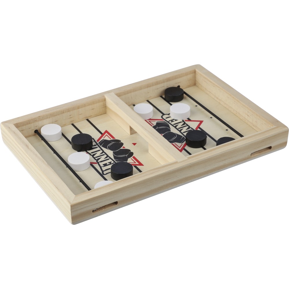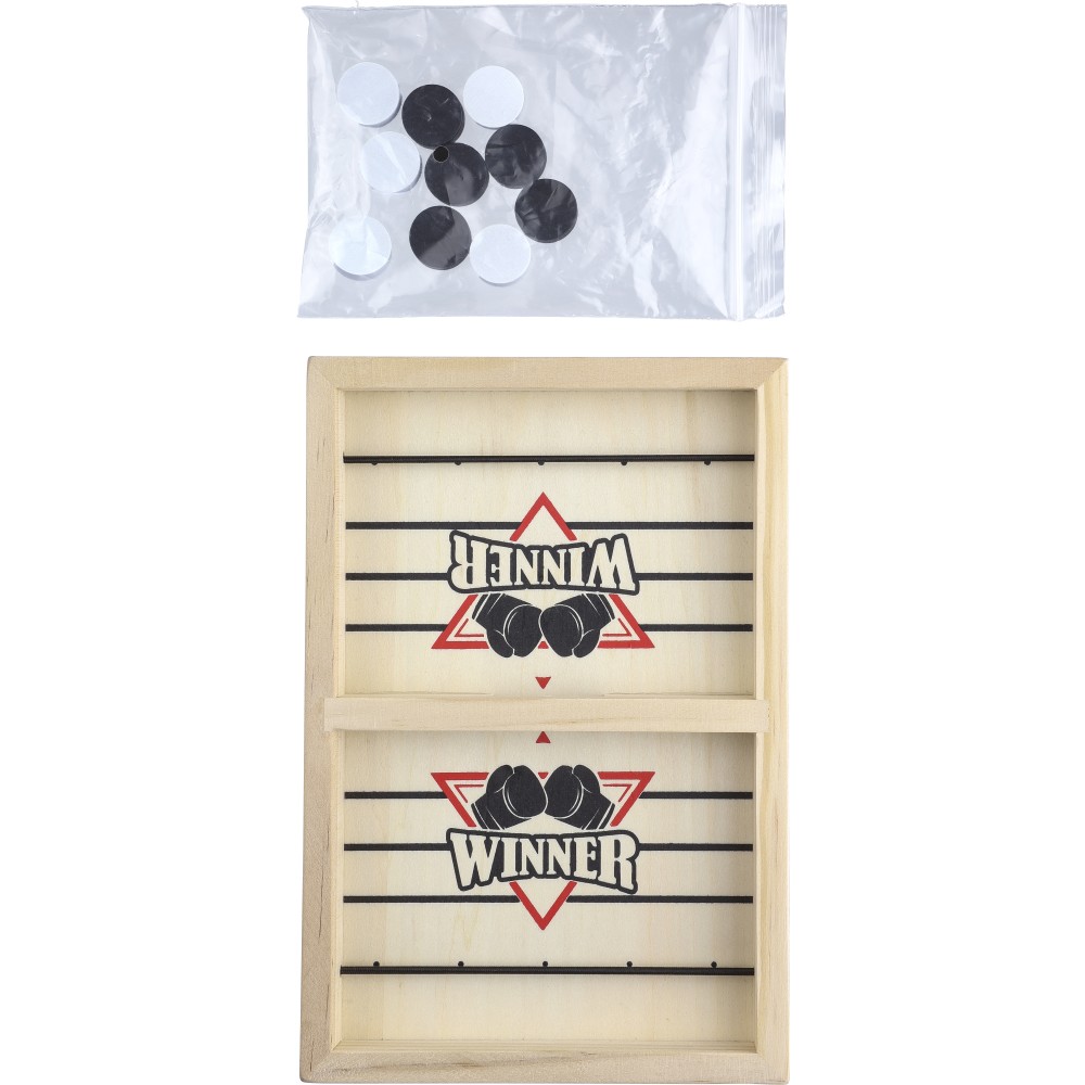 Tartalma 10 db korong (5 db fekete, 5 db fehér) és egy játékszabály. Gyorsan elsajátítható játék gyerekek és felnőttek számára. A flipperre és a gombfocira emlékeztető játék, amire sling puck néven keresve több videót találhattok. Csomagolása illusztrált barna papírdoboz.