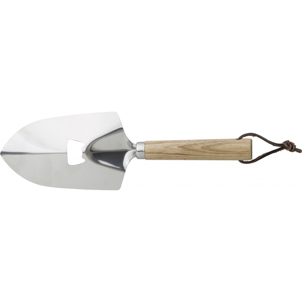 Kertészlapát fa nyéllel, üvegnyitó funkcióval. Csomagolása barna papírdoboz.