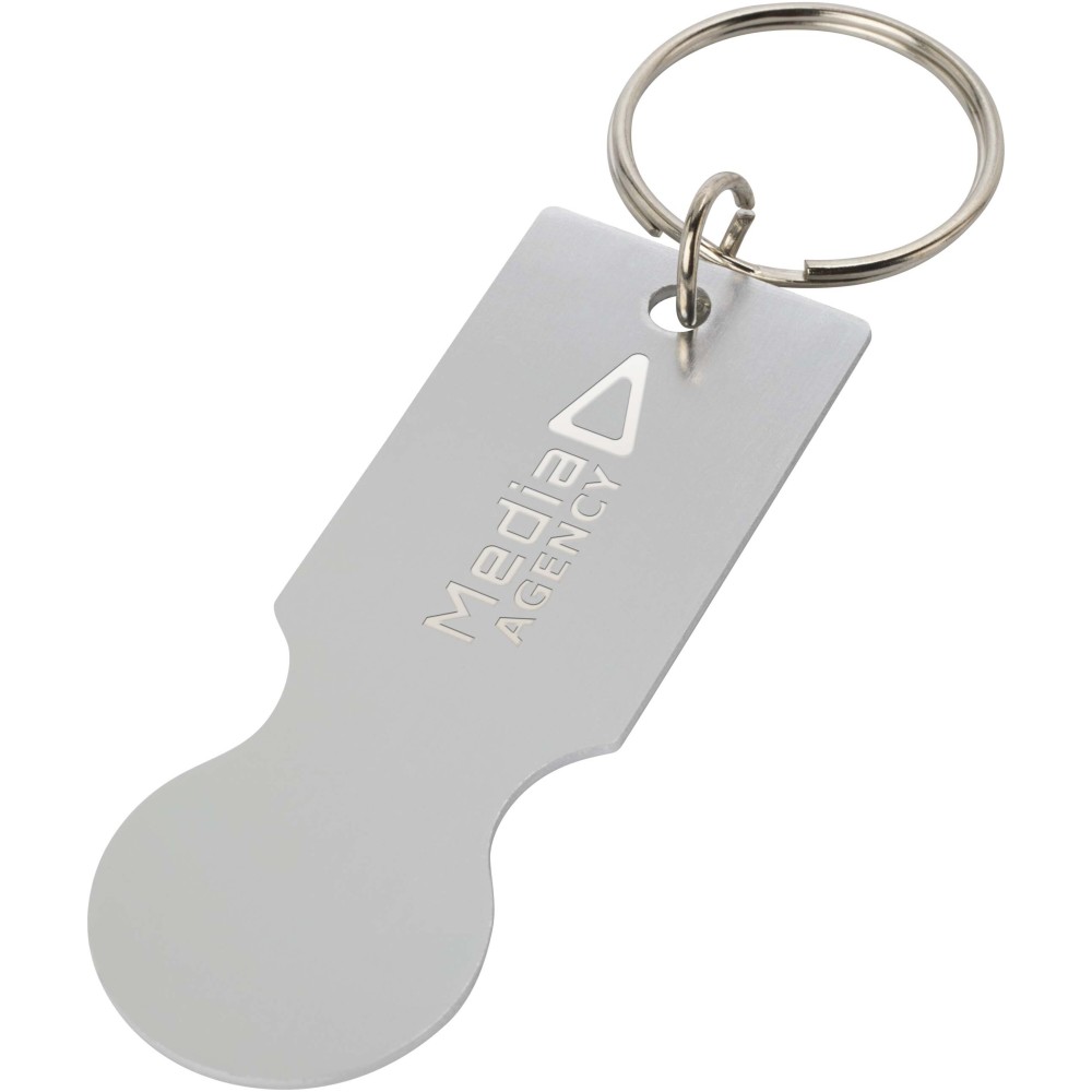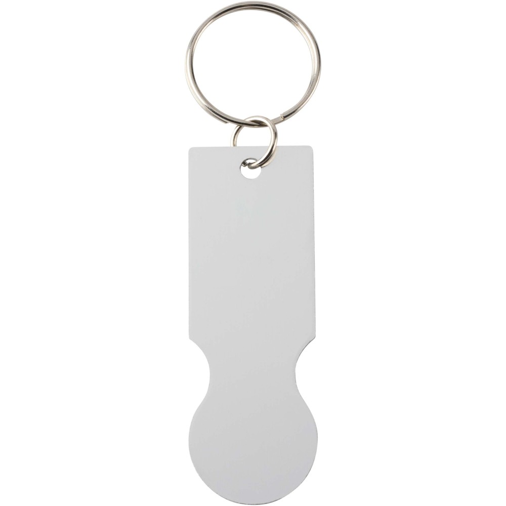 A Rhea fém kulcstartó bevásárlókocsi érmével a legtöbb szupermarket bevásárlókocsijához illeszkedik, lehetővé téve azok kinyitását érme vagy zseton nélkül.
