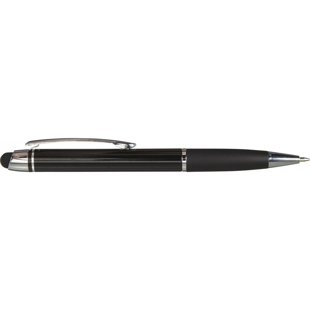 Golyóstoll érintővel, fényes felülettel, színben illeszkedő gumis fogórésszel, fényes ezüst kiegészítőkkel, fekete tollbetéttel. Alumínium.