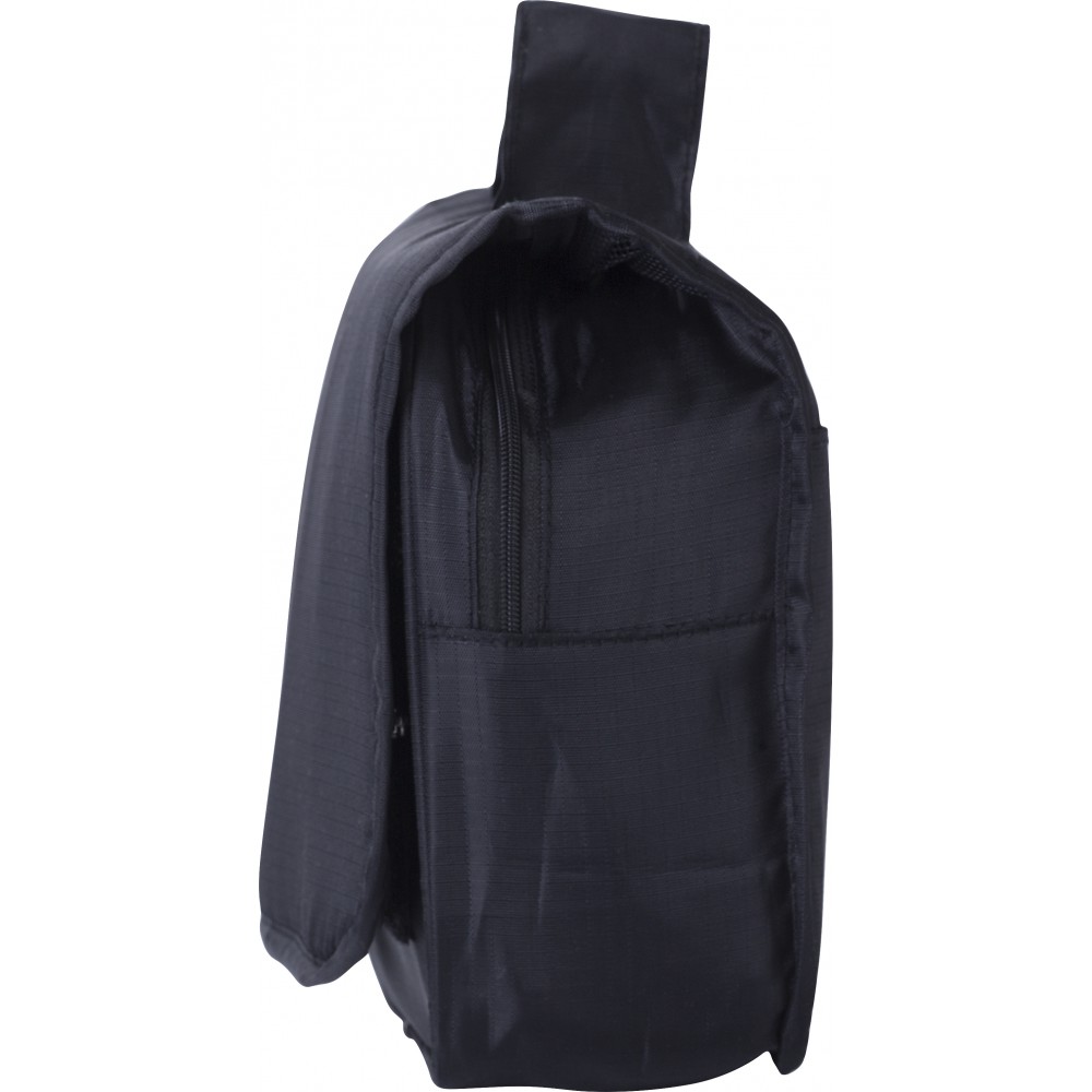 Piperetáska akasztóval. Kinyitva felül átlátszó zseb. Belül egy nagy cipzáras hálós zseb és egy kis zárt cipzáras zseb található. Hátoldalán egy rekesz. Rövid fogantyú. Ripstop 210D.