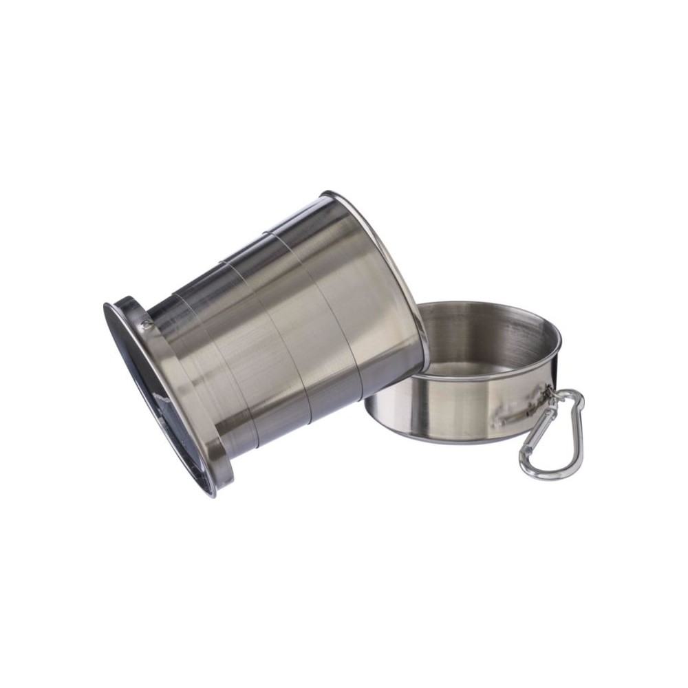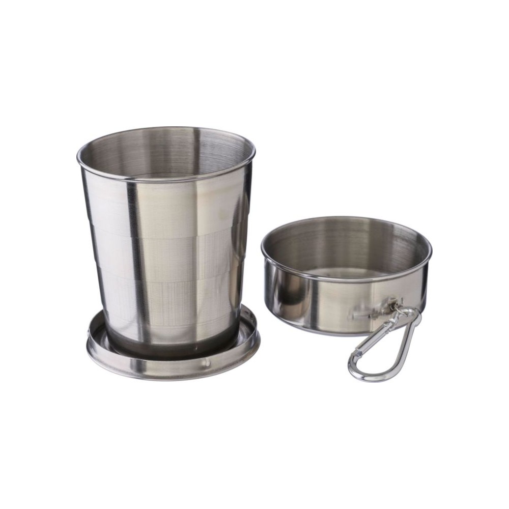 Összecsukható pohár fém karabinerrel. Egyenként barna kartondobozba csomagolva. Anyaga: rozsdamentes acél. Űrtartalom: 220 ml.