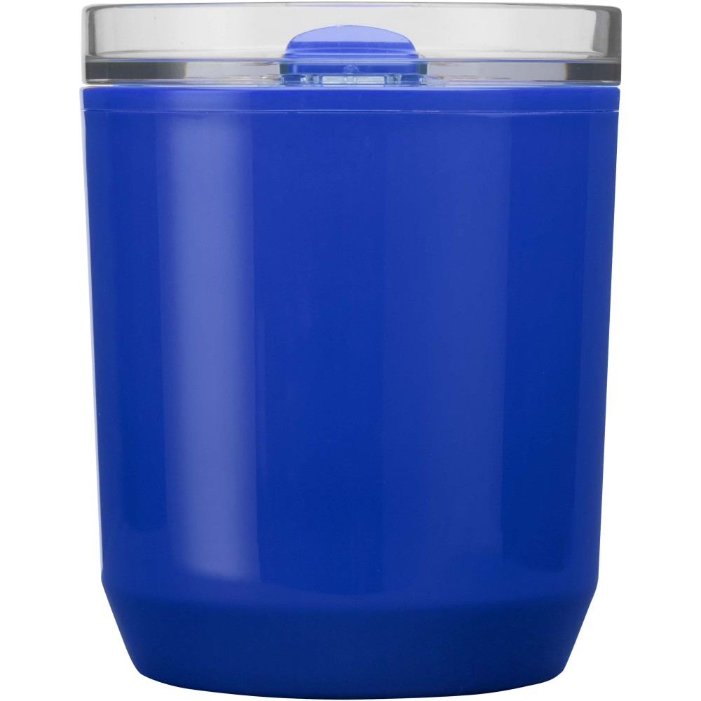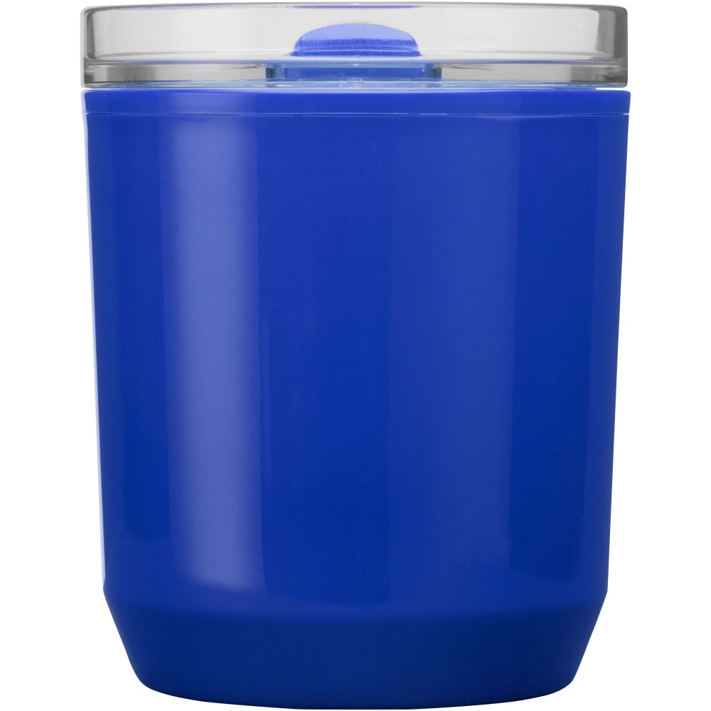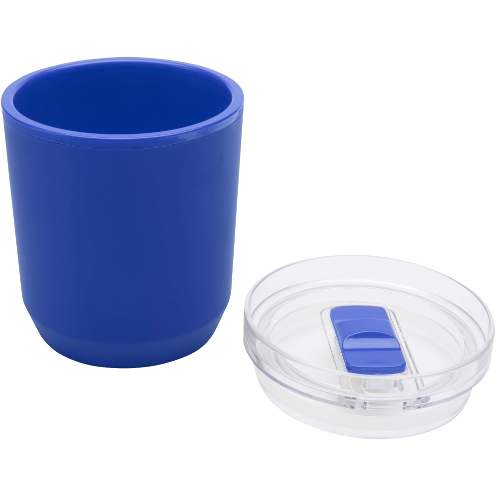 Egyszerű kialakítású termoszbögre, amely a legtöbb kávégéppel és autós pohártartóval kompatibilis. Dupla falú szerkezettel rendelkezik, újrahasznosított PP műanyag külsővel és PP műanyag belsővel. A csúsztatható fedél AS és PP műanyagból készült. Űrtartalma: 180 ml.