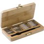 25 darabos szerszámkészlet bambuszdobozban. 24 db hegy és egy fogó. Csomagolása barna papírdoboz.