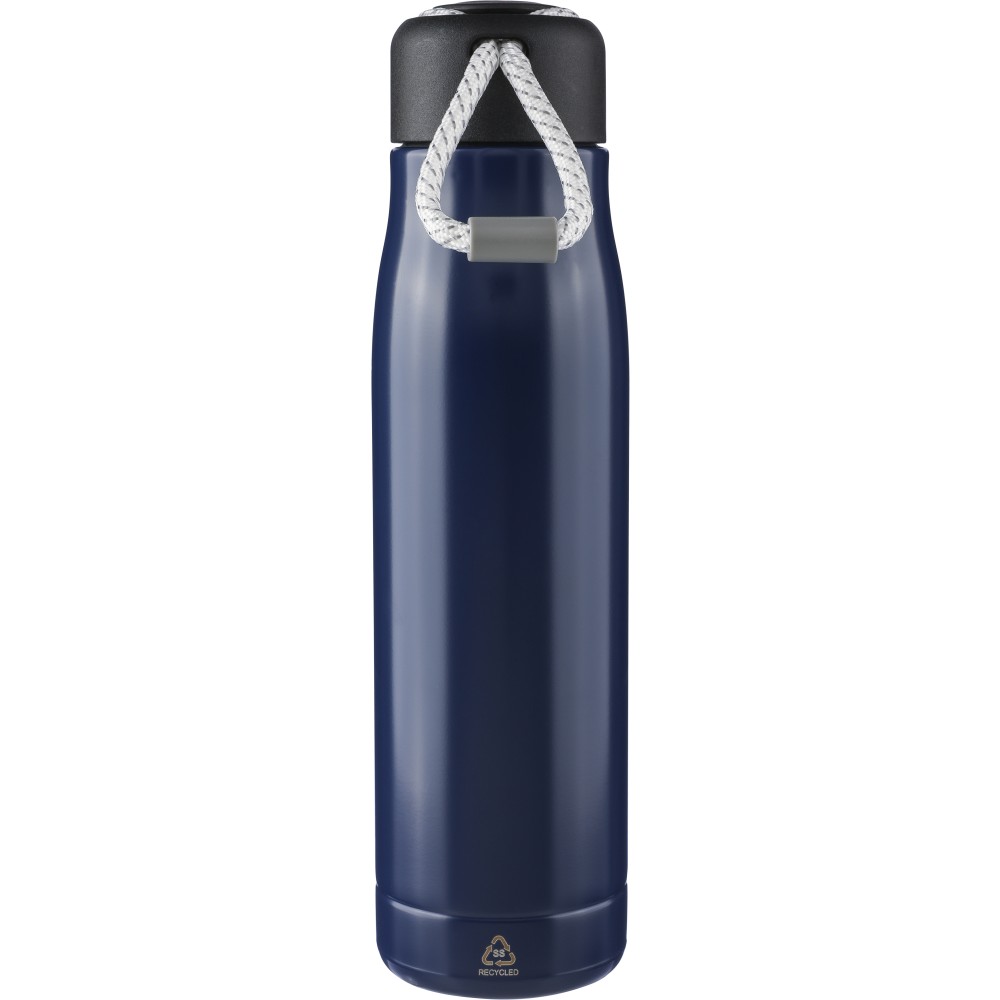 Újrahasznosított rozsdamentes acélból készült duplafalú, vákuumszigetelt termosz, 500 ml-es. Belseje 304-es, külseje 201-es rozsdamentes acél. Csavaros PP kupakkal, poliészter hordozópánttal. Hőszigetelésre és mindennapos használatra tervezve. Az újrahasznosított anyagra utaló gravírozott logóval. Csomagolása barna papírdoboz.