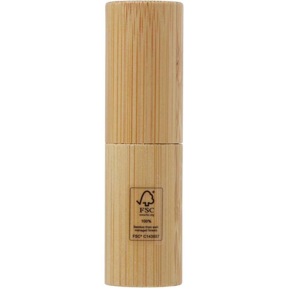 Ajakápoló. Védelmet nyújt a nap ultraibolya (UV) sugarai ellen. Úgy tervezték, hogy hidratálja és védje az ajkakat. A külső burkolat bambuszból készült. Jó választás magánszemélyek és vállalkozások számára, akik a fenntarthatóbb ternékeket részesítik előnyben. Az illata vanília. Szavatosság: vásárlástól számított 3 év. Bambusz. FSC 100% N5 CU-COC-877277.