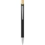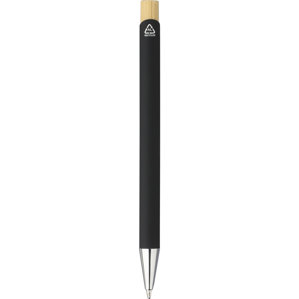 Bambusz írószerkészlet, amely egy bambuszból és gumírozott, újrahasznosított alumíniumból készült golyóstollat tartalmaz kék tintával, bambusz nyomógombbal és krómozott műanyag heggyel. Bambuszból és gumírozott rozsdamentes acélból készült téglalap alakú kulcstartóval. Mindkét termék felülete lézergravírozás után tükörhatású lesz, és újrahasznosított alumínium logóval van ellátva. Bársonyberakásos, kraftpapír dobozban csomagolva.