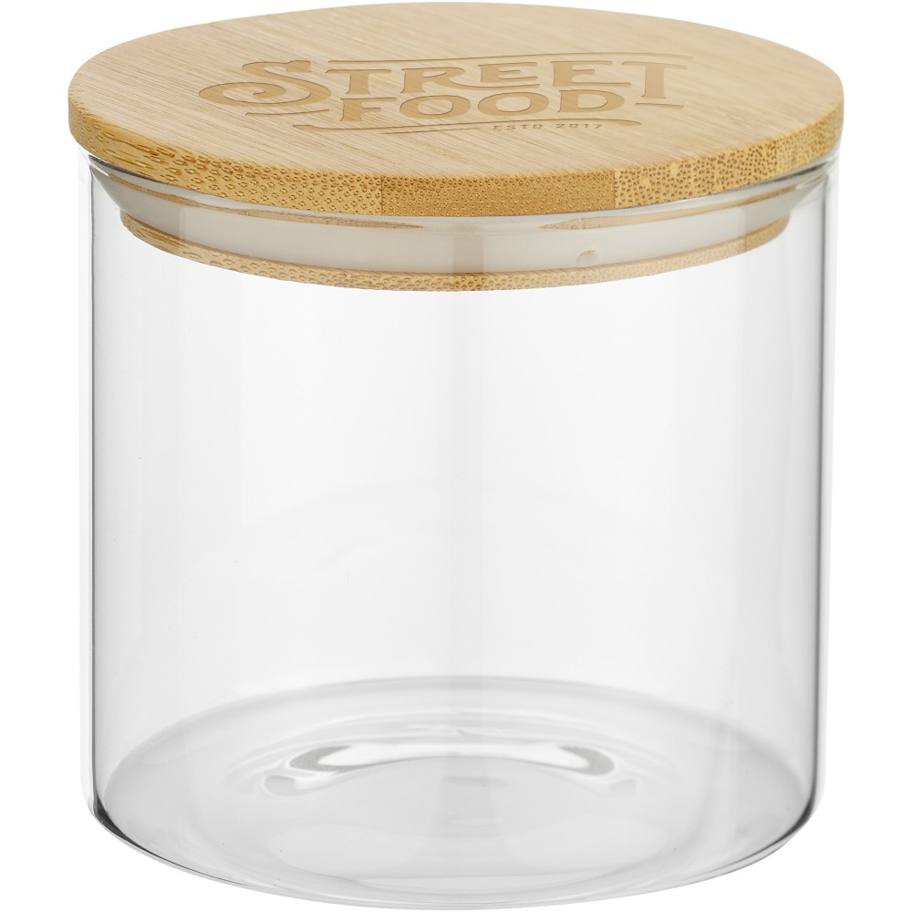Üvegből készült kisméretű ételtartó bambusz fedéllel. Egyesíti a biztonságos és tartós anyagnak számító üveg előnyeit a bambusz megújuló tulajdonságaival. Az üvegtartó (fedél nélkül) mikrohullámú sütőben és mosogatógépben mosható. Újrahasznosított kraftpapír dobozba csomagolva. Űrtartalom: 320 ml.