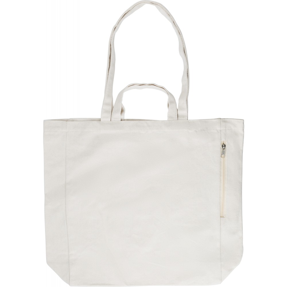 Újrahasznosított pamut bevásárlótáska rövid és hosszú füllel. Oldalt cipzáras zseb. 350g/m2