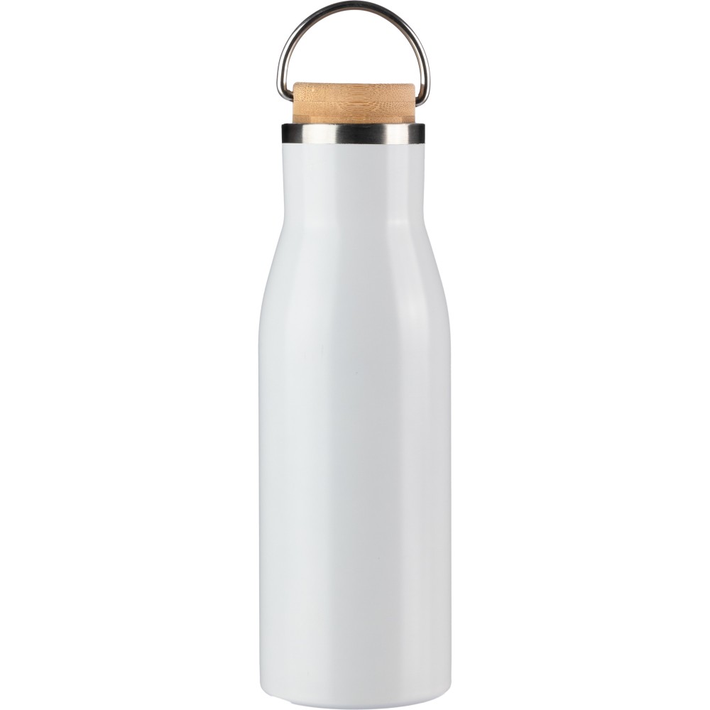 Újrahasznosított rozsdamentes acél palack bambusz kupakkal. Belül 304-es, kívül 201-es rozsdamentes acél. A palackon újrahasznosítást jelölő logó található. Űrtartalom: 500 ml.