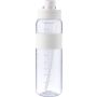Tritán kulacs, 900 ml-es. Kétféle használati lehetőséggel: csavaros záródású kupak vagy visszahajtható végű szívószál. Szilikon markolattal, PP hordozófüllel és nyomtatott űrtartalom-jelzővel.